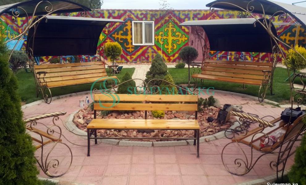 Длина 1.5 метра. Материал: стальные профильные трубы; кузнечный металлопрокат; доски лиственница.