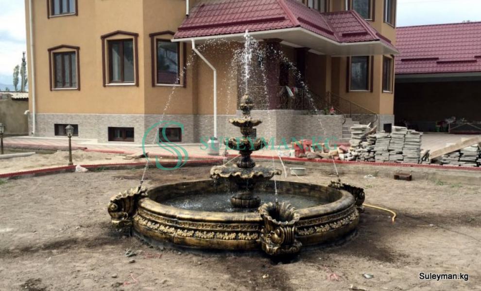 Фонтан «Каскад» средний. Размеры: диаметр 3 метра, высота 2 метра. Материал: гидротехнический бетон. Покраска: спец. краска для бассейнов, производство Германия. Вы можете заказать эксклюзивный фонтан или купить готовый в наших мастерских в Бишкеке и Балыкчы. Наша компания занимается изготовлением и монтажом фонтанов на всей территории Кыргызстана.