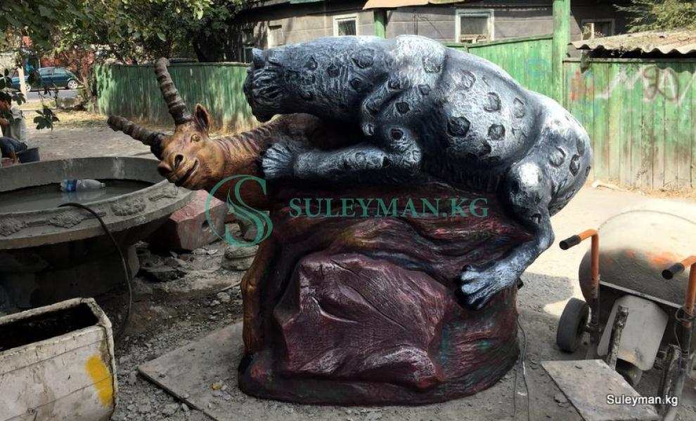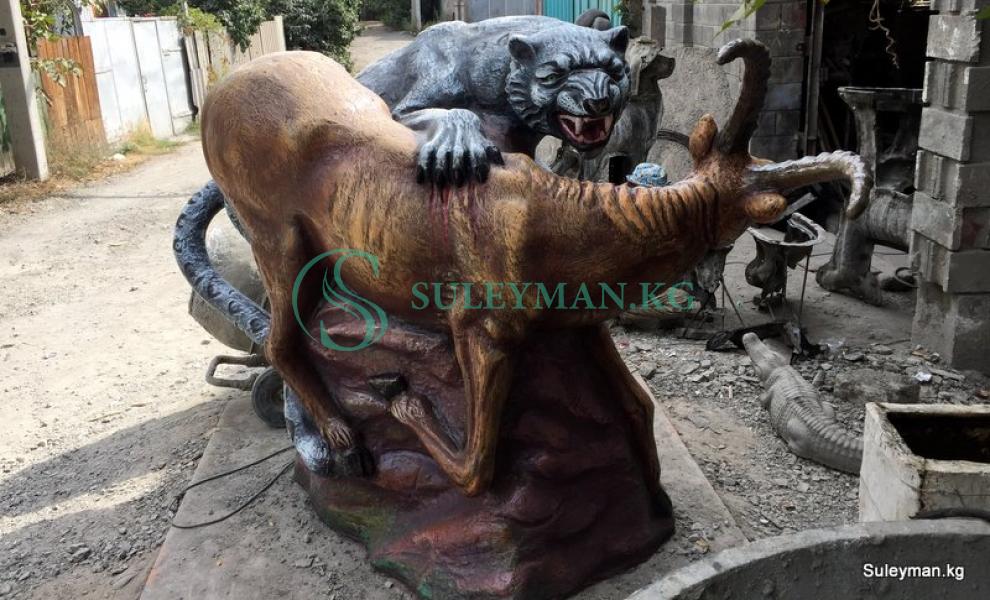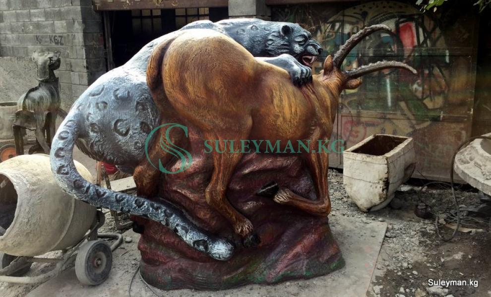 Скульптурная композиция «Барс нападает на архара». Материал: бетон. Размеры: высота 165 см, длина 250 см (от рогов архара до хвоста барса), ширина 120 см.