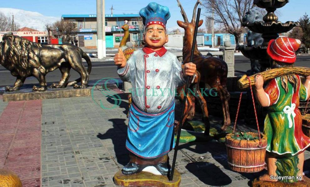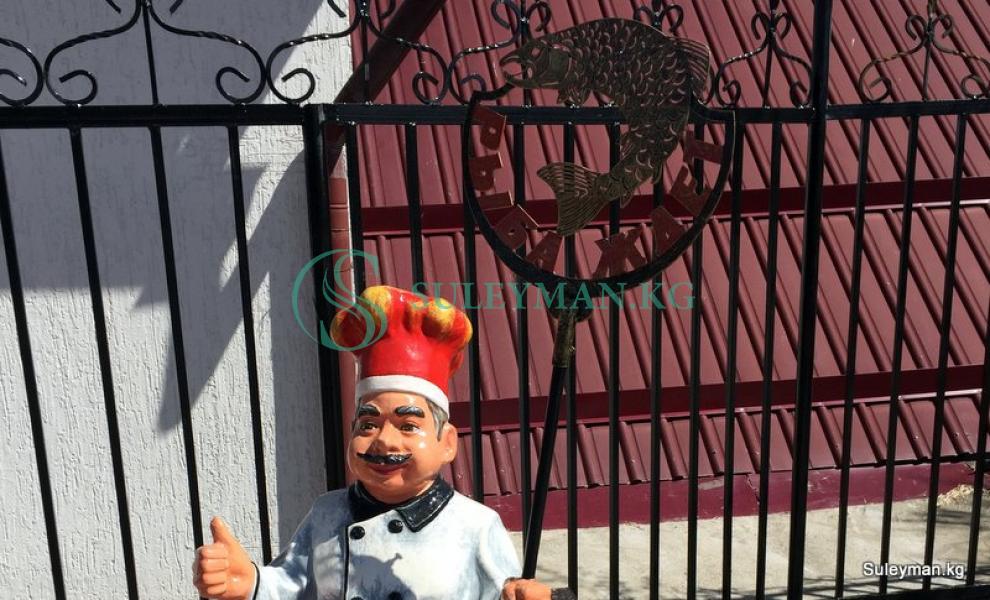 Вы можете установить табличку на трубу в руках повара. С названием вашего кафе или пожеланиями приятного аппетита и тд. К примеру ,как показано на последнем фото, в одном из форелевых хозяйств написали на табличке «Рыба ждет». Стоимость изготовления таблички входит в стоимость скульптуры 15000 сом.