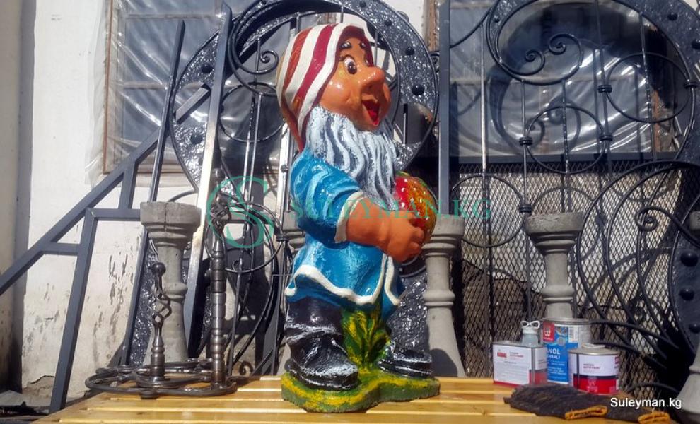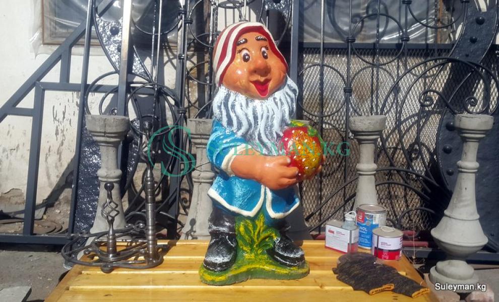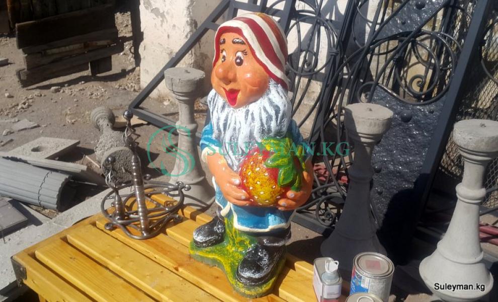 Скульптура Гнома «Мальчик с клубничкой» идет в паре с другой фигуркой гнома — Гном девочка клубничка. Материал: армированный бетон. Размеры: высота 80 см , основание 36*25 см. Вы можете заказать или купить скульптуры, фигурки и статуэтки различных персонажей и животных для ландшафтного дизайна в наших мастерских в Бишкеке и Балыкчы.